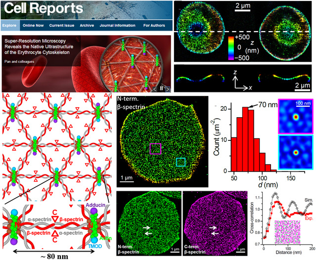 红细胞是人血液中数量最多的一种细胞,主要负责氧气和二氧化碳的运输,保障生命活动正常进行。红细胞呈现特有的双凹圆饼状形态并具有极强的变形性和稳定性,保证其在120天寿命中往返动静脉上百万次,行程约480km循环过程中不断承受大血管中的流体剪切力和比自己直径还小的毛细血管挤压力而不破损。红细胞虽已被人类认知300多年,但是诸多的机制仍尚不清楚,如细胞形态、变形性与细胞骨架的关系等。近日,看球88 潘雷霆副教授与合作者美国加州大学伯克利分校Ke Xu教授基于超分辨光学成像技术在红细胞骨架结构与特性研究方面获重要进展,相关结果以“Super-Resolution Microscopy Reveals the Native Ultrastructure of the Erythrocyte Cytoskeleton”为题发表在国际知名学术期刊《Cell Reports》。
