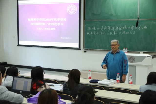 理论学习正式开始,周文壮为全体新生团员进行第一次团校培训。周文壮结合习近平总书记在高校思想政治工作会议讲话、新生开学典礼曹雪涛校长讲话引导同学们深入理解校训的深刻含义。接下来,周文壮向同学们介绍了周恩来、陈省身、吴大猷等南开杰出校友,着重介绍了唯一被授予烈士称号的两弹一星元勋郭永怀的感人事迹。今年的12月5日是郭永怀为公牺牲50周年的日子,周文壮倡议,开展学习郭永怀精神主题征文活动,号召南开学子以郭永怀先生为榜样。最后,周老师殷切寄语学员,以看球88 获评“三全育人”十点为契机,秉承南开先贤的公能意志,扎实基础知识,创新科研发展。