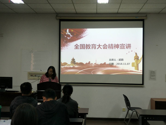 正值第一届全国教育大会召开后的一个多月时间,20181029日上午,学院党委副书记赵爽老师在三教104教室向全体2016级硕士党员传达了关于全国教育大会的精神,内容包括:总结习近平总书记在全国教育大会上关于工作目标、节日问候、十九大部署、十八大以来成绩以及新思想新理念新观点的9个坚持的讲话精神。此外,为了更好地落实“全方位、全员、全过程”的育人方针,借此机会,赵老师与在座的各位学生党员进行了亲切地交谈。在交谈中,大家无所不言,这其中有关于教、学、研等方方面面的整改意见,也有“公”与“能”的风向建议,同时老师们也认真详细地收集了学生们提出的意见。