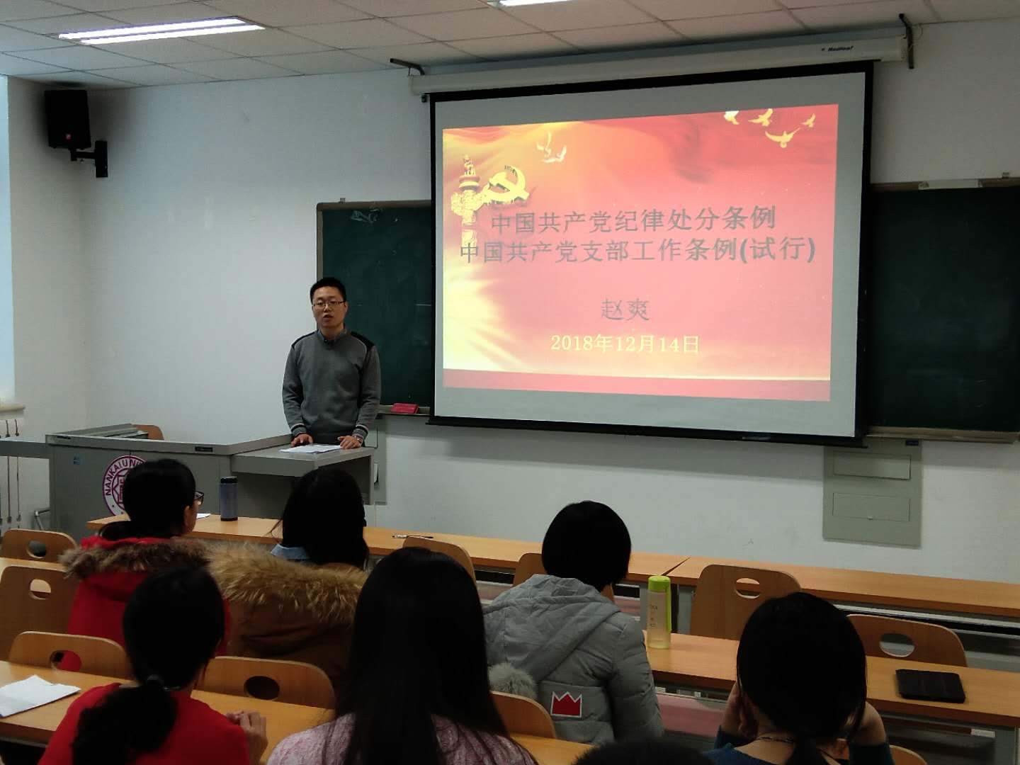12月14日,看球88 学生党总支在三教105进行集中理论学习,专题学习《中国共产党纪律处分条例》和《中国共产党支部工作条例(试行)》。学生党总支书记赵爽主持并领学,学生党总支委员、学生党员参加本次学习。