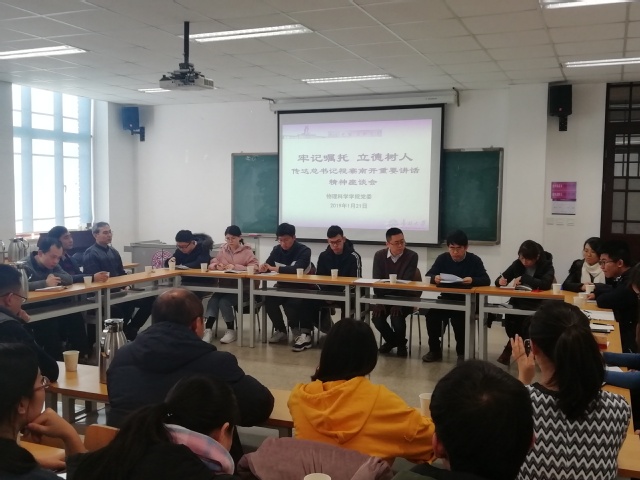 院党委副书记赵爽介绍了习近平总书记视察南开大学时学院师生的参与情况与反响,传达了在此过程中习近平总书记的重要讲话精神。17日上午,在天津考察调研的习近平总书记来到南开大学,参观了百年校史主题展览,并与部分院士、专家和中青年教师代表互动交流,随后察看了化学学院和元素有机化学国家重点实验室的有关情况,详细地了解南开大学历史沿革、学科建设、人才队伍、科研创新等情况,对南开百年来的办学理念和办学成绩给予充分的肯定,寄语南开师生把学习的具体目标同民族复兴的宏大目标结合起来,为之而奋斗。
