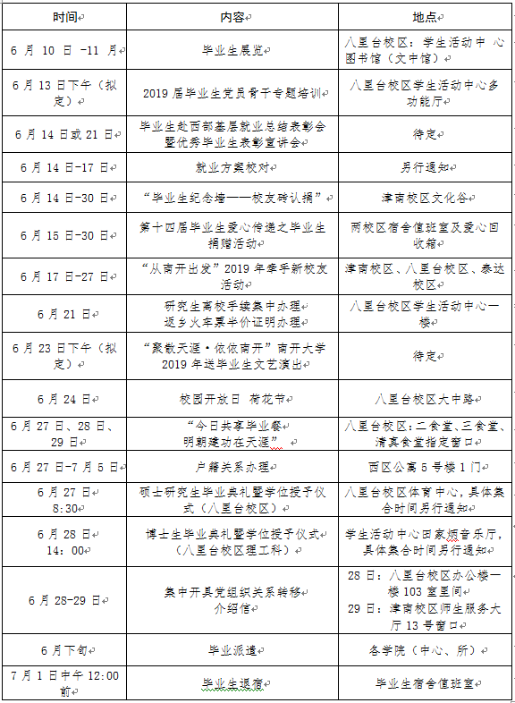 1.研究生毕业生(包括本校师资及在职人员)统一办理离校手续。时间:6月21日,地点:津南校区综合业务西楼报告厅大厅(9:30-15:30)和八里台校区学生活动中心一楼大厅(8:30-11:30;13:30-16:30)。本人不能亲自办理者可委托他人代办。