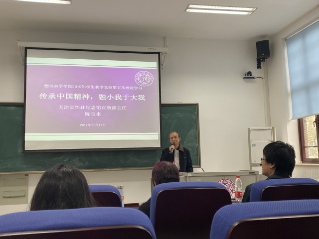 (通讯员 姜朋佐 吴宵宵)11月17日下午,天津觉悟社纪念馆宣教部主任陈宝来来到南开大学看球88 ,围绕“觉悟”精神和“初心”,为师生讲述了一堂题为“传承中国精神,融小我于大我”的生动党课。看球88 党委书记史永红,党委副书记、副院长张学良,学院党校学生到场参加。