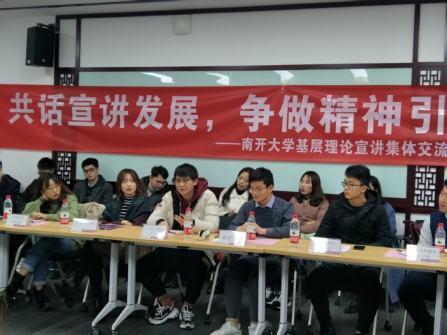 座谈会上,红色记忆宣讲团、新觉悟社和马院宣讲团指导教师刘一博论述了宣讲模式在“大思政”育人工作中的重要作用,并对宣讲工作的发展提出了指导和建议。随后,南开大学博士生讲师团、红色记忆宣讲团、新觉悟社、杨石先精神宣讲团、学生永怀精神宣讲团学生代表分别介绍了宣讲集体的宣讲主题与特色优势,并在现场进行了精选片段的展示。最后,宣讲集体代表围绕如何完善团队组织架构、充实丰富内容、创新宣讲形式、提升宣讲水平、拓展宣传渠道、落实宣传效果等问题展开了交流讨论,团学组织代表就如何形成宣讲合力、发挥新媒体平台在思想引领方面的作用发表看法,现场气氛热烈。