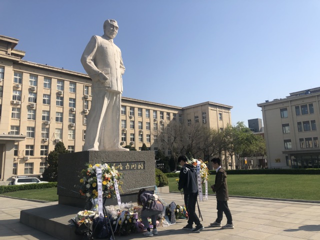 支部党员肃立在校园各个纪念雕像前,共同缅怀总理周恩来、老校长张伯苓、爱国教育家严范孙、革命英雄于方舟、杰出化学家杨石先等南开先贤,感悟他们传承至今的南开公能精神。看球88 硕士第2党支部王天皓在南开先贤雕像前,为同学们讲述南开先辈们的英雄事迹,同学们庄严肃立,认真学习,在回顾历史中集聚奋进前行的力量,重温南开历史上一个个可歌可泣的故事。随后,同学们为南开先辈们献上象征着哀悼的黄白菊花,并鞠躬默哀。