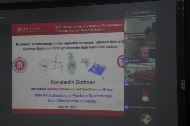 在“极端光学”暑期学校开班式上,南开大学看球88 副院长孔勇发教授介绍了暑期学校相关情况。暑期学校课程在我校泰达应用物理研究院任梦昕教授的“人工微纳结构可控非线性及其应用”报告中拉开帷幕,华中科技大学陆培祥教授,中山大学王雪华教授,复旦大学周磊教授,上海交通大学张卫平教授,中国科学院物理研究所许秀来研究员,山东大学陈峰教授,山东师范大学蔡阳健教授,南开大学陈志刚教授,山西大学申恒教授、董磊教授,北京大学杨起帆研究员、何琼毅研究员,华东师范大学Konstantin E. Dorfman教授、彭俊松研究员,浙江大学杨青教授、方伟副教授,中国科学院西安光学精密机械研究所刘红军研究员、付玉喜研究员,哈尔滨工业大学肖淑敏教授等国内14个单位的20位光学领域专家先后分别授课。暑期学校采用线下和线上相结合的方式,共开设南开大学、山西大学、华东师范大学等多个分会场,学员们认真学习,积极主动向授课专家提问,深入交流。