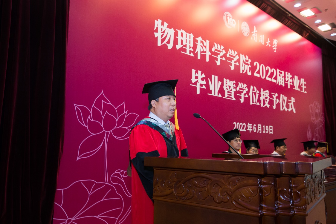 仪式在庄严的国歌声中拉开帷幕。院长张国权向学院全体毕业生致辞。他深情、深刻地指出“南开的优良传统与精神,需要我们共同继承发扬;学院的未来和发展,需要我们共同拼搏创造”。在这个特殊的日子里,张国权向学院全体毕业生提出了几点希望:一是家国两相依,勇于担当和奉献。“爱国主义是南开人的底色。你们生逢其时,重任在肩,是具有家国情怀的新时代青年,心有大格局,将小我融入大我,把自己的理想同祖国的前途、把自己的人生同民族的命运紧密相连,勇于担当,奉献国家。”二是惜取少年时,保持激情与热爱。“人生不能穿越,青春去而不返。没有了为梦想而奋斗的激情,终将会留下遗憾。让我们珍惜美好青春,保持激情,不忘初心,带着热爱前行。”三是坚毅笃行,坚持拼搏与奋斗。“在今后的人生路上,遇到困难,要勇敢面对,锲而不舍地拼搏奋斗。南开求学的经历,是你们人生中的美景,是荣誉也是责任。希望你们从离开校园的这一刻起,珍惜荣誉,承担责任,砥砺前行,再创辉煌。”