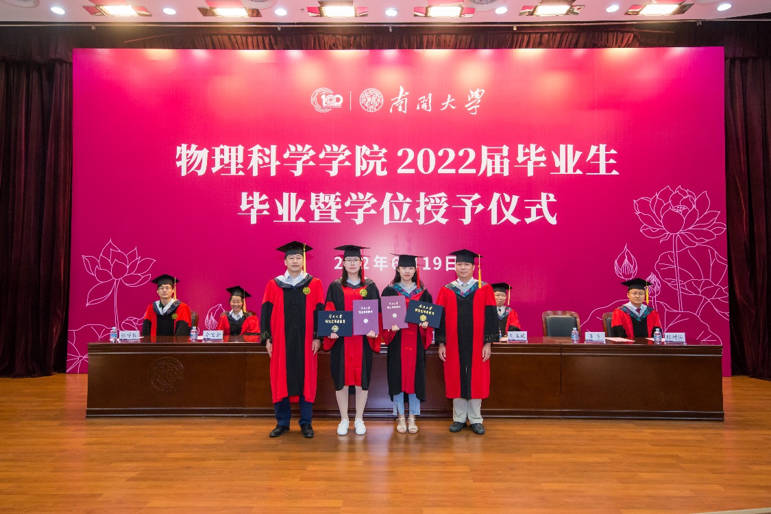伴随着《大学生进行曲》、《夺标进行曲》、《光荣的凯旋》等乐曲,到场参加仪式的近百名本科、硕士研究生毕业生依次走上主席台。院领导一一为他们拨正帽穗。随后,11名博士毕业生依次走上主席台,张国权为每一位博士毕业生颁发证书与拨穗,并代表学院向2022届全体博士毕业生表示热烈祝贺。学位帽上的帽穗从右到左,象征着同学们从南开大学毕业,从百年物院再出发,踏上人生新征程。