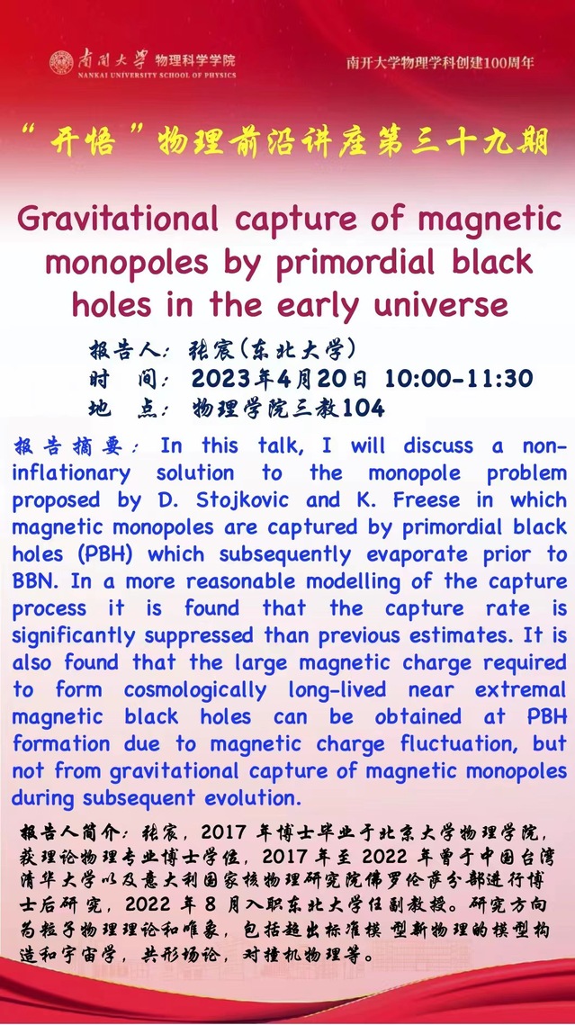 【“开悟”物理前沿讲座(第 39期)】Gravitational capture of magnetic monopoles by primordial black holes in the early universe