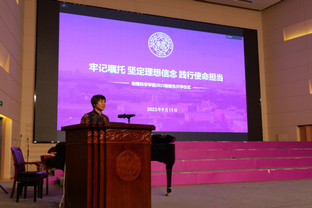 学院党委书记史永红以“牢记嘱托 坚定理想信念 践行使命担当”为题,为新生讲授开学第一课。史永红从习近平总书记历次重要讲话精神出发,介绍了从烽火中走出的南开大学历史,带领同学们回顾了老校长杨石先、南开物理学长郭永怀科研报国的往事,学习了当代南开物理人投笔从戎、敢为人先、勇于开拓的先进事迹。她鼓励同学们,青年强则国强,作为南开物理青年,要传承南开大学的光荣爱国传统,把学习的具体目标同民族复兴的伟大目标结合起来,将小我融入大我,既要脚踏实地,又要仰望星空,勇攀世界科技高峰。