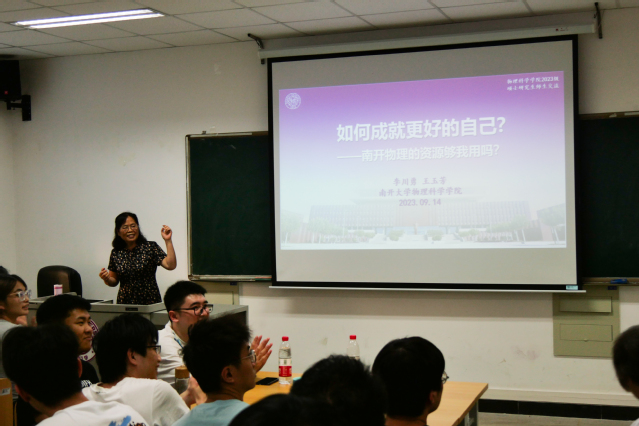 李川勇以“如何成就更好的自己?——南开物理的资源够我用吗?”为题,从研究生常遇见的问题、常见问题的剖析与思考、资源利用与积极行动几个方面,向同学们介绍应如何定位研究生身份、如何牟定目标并采取积极行动。她认为,同学们应加强对内部自我世界及外部社会世界的探索,善用师生交流、课程参与、科研工作、朋辈交流、助教经历、社团活动、社会服务等学校资源加强自身通用能力与专业能力,未来顺利向思想上独立思考、情感上与他人共情、行动上自我约束的社会人转变。王玉芳、涂成厚两位老师鼓励同学们多与学院教师交流,提前做好学涯生涯规划,成为对国家发展有用的人。