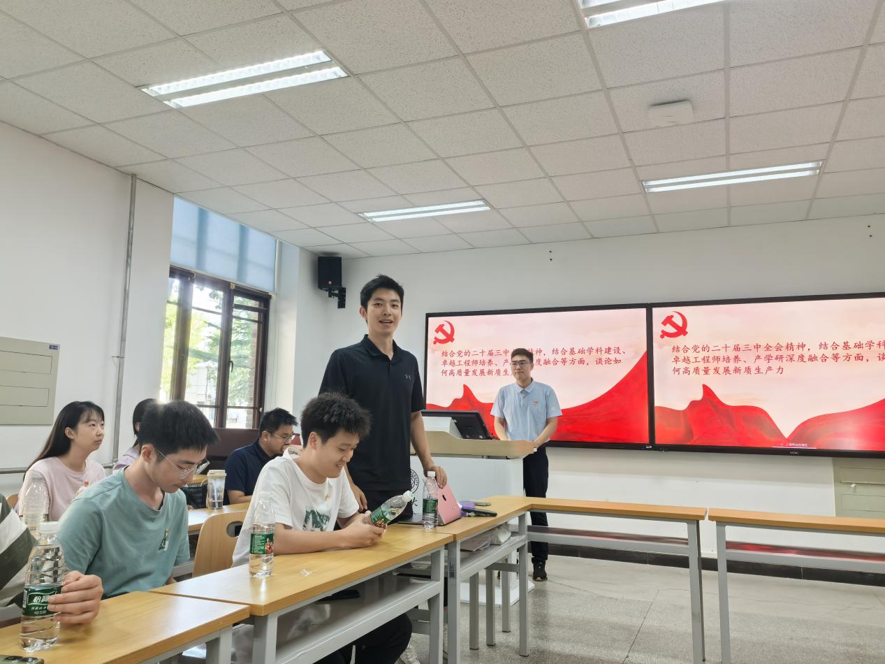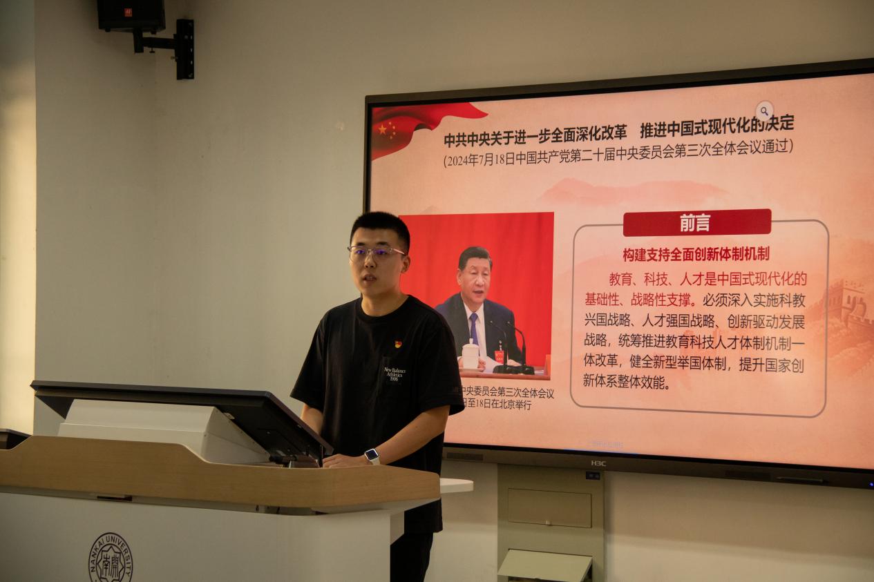 活动中,南开大学看球88 博士第一党支部书记朱鹏飞进行了题为《党的二十届三中全会:推进教育科技人才体制机制改革》的报告,带领与会成员学习了党的二十届三中全会在深化教育综合改革、深化科技体制改革、深化人才发展体制机制改革这三个方面做出的重要部署。