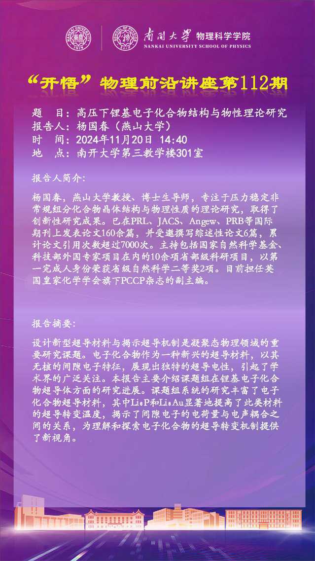 【“开悟”物理前沿讲座 (第112期)】高压下锂基电子化合物结构与物性理论研究
