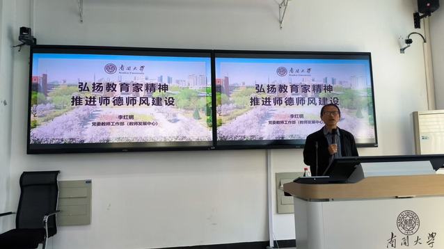 党委教师工作部副部长李红钢作“弘扬教育家精神 推进师德师风建设”专题讲座,他从教育家精神的提出、教育家精神的主要内容、南开大学的工作实践、“十项准则”解读及相关案例这四方面进行详细讲解,报告脉络清晰,加深教师对教育家精神和“新时代高校教师职业行为十项准则”的理解。