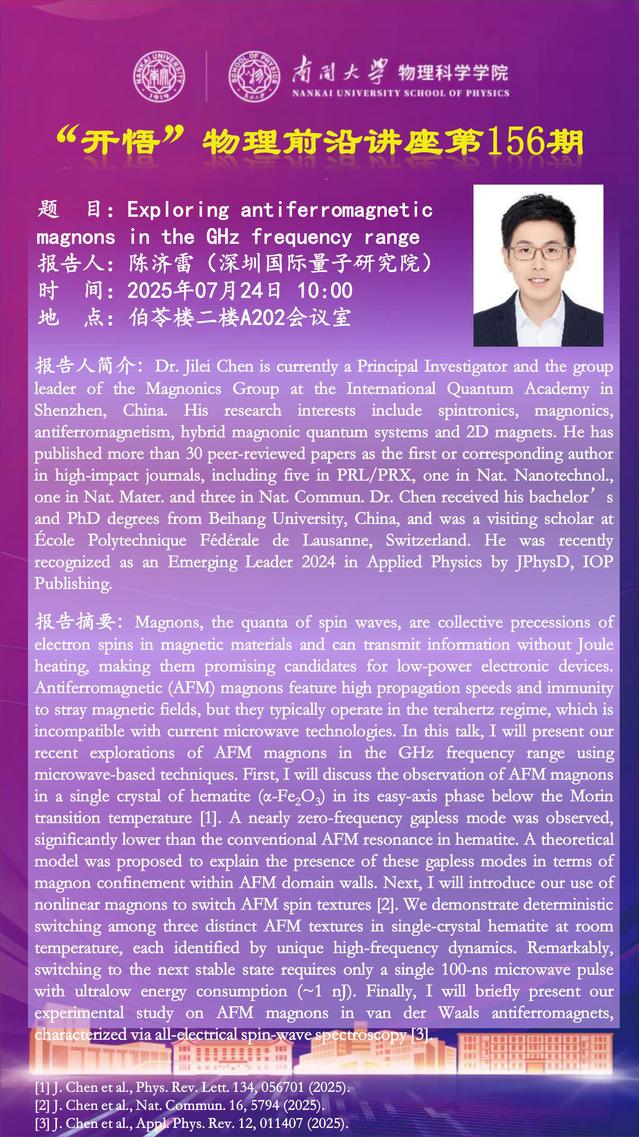 【“开悟”物理前沿讲座 (第156期)】Exploring antiferromagnetic magnons in the GHz frequency range