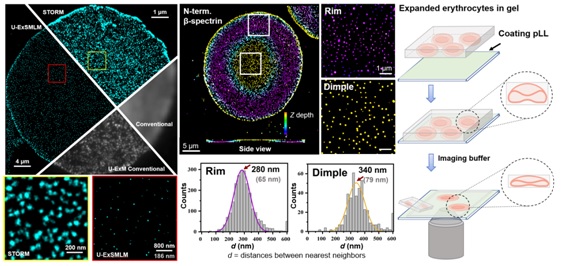 Expansion microscopy (ExM) has been established to be compatible with existing super-resolution microscopy to further improve the resolution, including SIM (Ex-SIM) and STED (Ex-STED). However, attempts to combine single-molecule localization microscopy (SMLM) with ExM remain rare and have not been optimized, mainly due to the sharp shrinkage of hydrogel upon the application of imaging buffer. Recently, the research group of Prof. Pan Leiting and Prof. Xu Jingjun from Nankai University developed an ultrastructure expansion single-molecule localization microscopy (U-ExSMLM) based on poly-l-lysine adhering to avoid gel shrinkage. The effective resolution of U-ExSMLM reached the molecular level of ~ 6 nm. The ultrastructure of the cytoskeleton in human erythrocytes preserving the native biconcave morphology was investigated by U-ExSMLM. It was found that the the dimple region of erythrocytes had a longer nearest distance and lower density of spectrin skeletons than the rim region, which provided direct molecular resolution evidence for the asymmetry of the cytoskeleton in biconcave human erythrocytes.