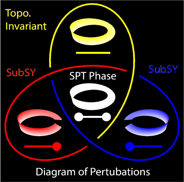Fig 1: A classification diagram of the perturbations in an SPT phase. The yellow-line-encircled region indicates a set of perturbations which respect a particular symmetry and they do not disrupt the topological invariant (Topo. Invariant) in the system. The boundary states are protected by only the sub-symmetry (SubSy), and the red-line- and blue-line-encircled regions indicate two SubSy-preserving sets of perturbations which change the overall topological invariant but support the SubSy-protected boundary states; the overlap region represents the topological phase with the topological invariant and its associated boundary state.